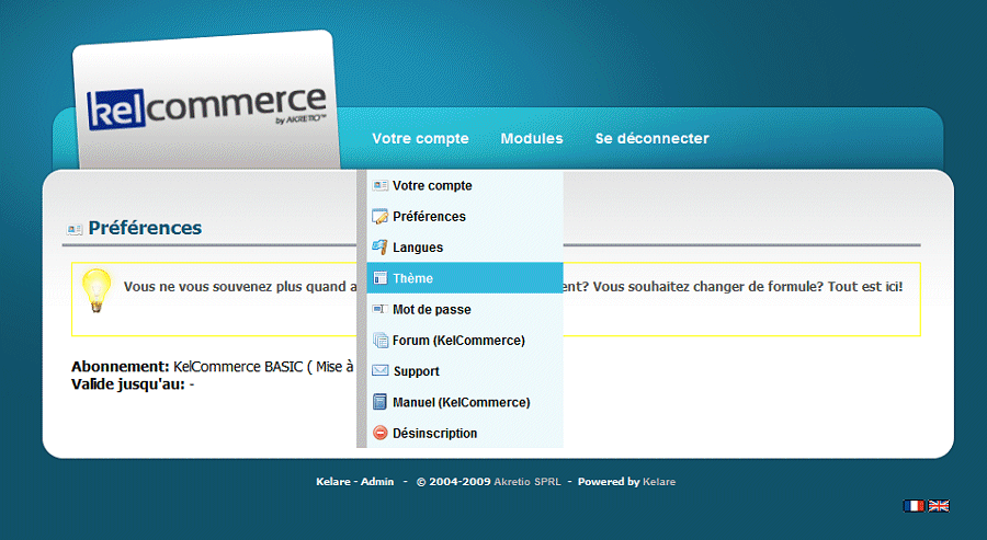 Vous pouvez choisir et changer votre thème à tout instant via le module d'administration. Pour ce faire, rendez-vous sur la page thème.