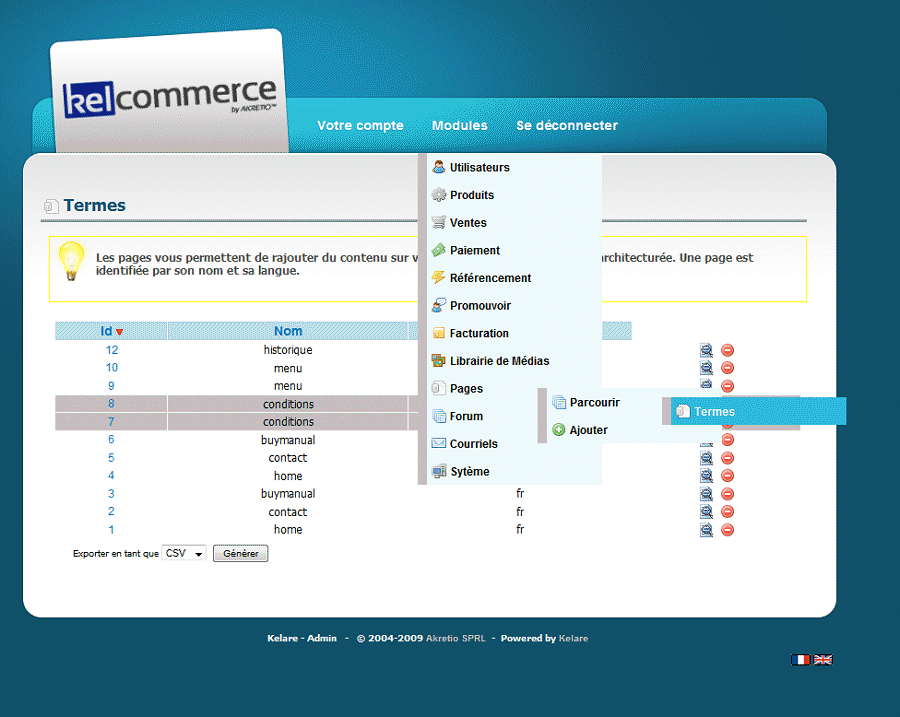 Cliquez ensuite sur "conditions" dans la langue que vous désirez éditer et vous pourrez modifier le texte correspondant aux conditions générales.